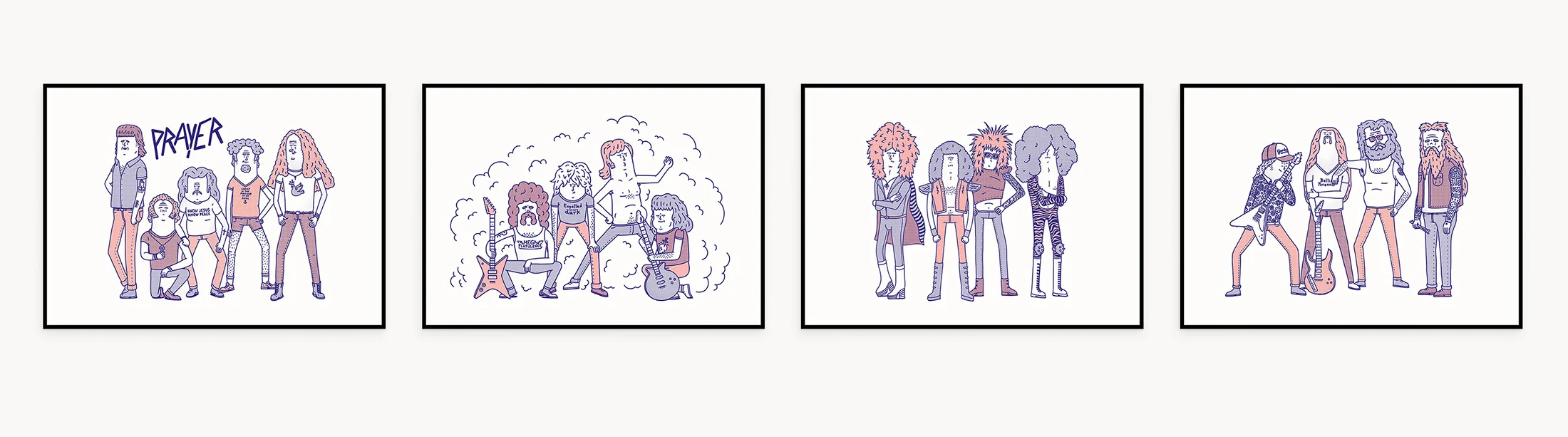 4 fictitious bands strike a pose on these high quality giclée prints.